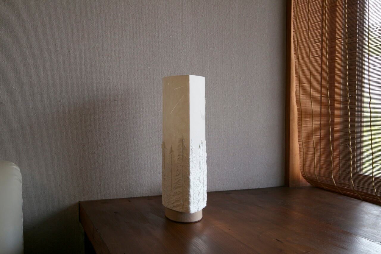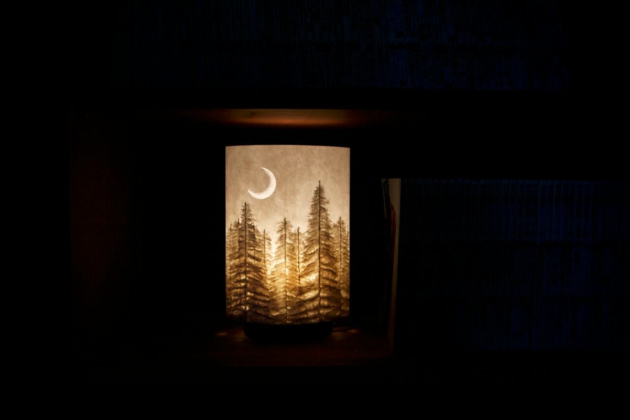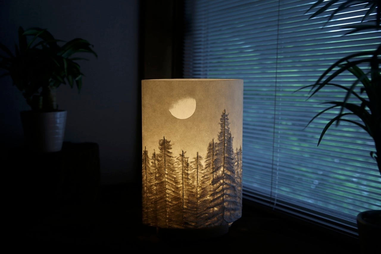木台の制作からシェードの組み立て、電材の組み立てから仕上げまで全て自社一人で制作しています。部材は全て安心の国産品を使用。そしてこの作品は破れる事がなく大変丈夫な筐体であるのも特徴です。お客様の中には20年以上ご愛用頂いている方もいらっしゃいます。